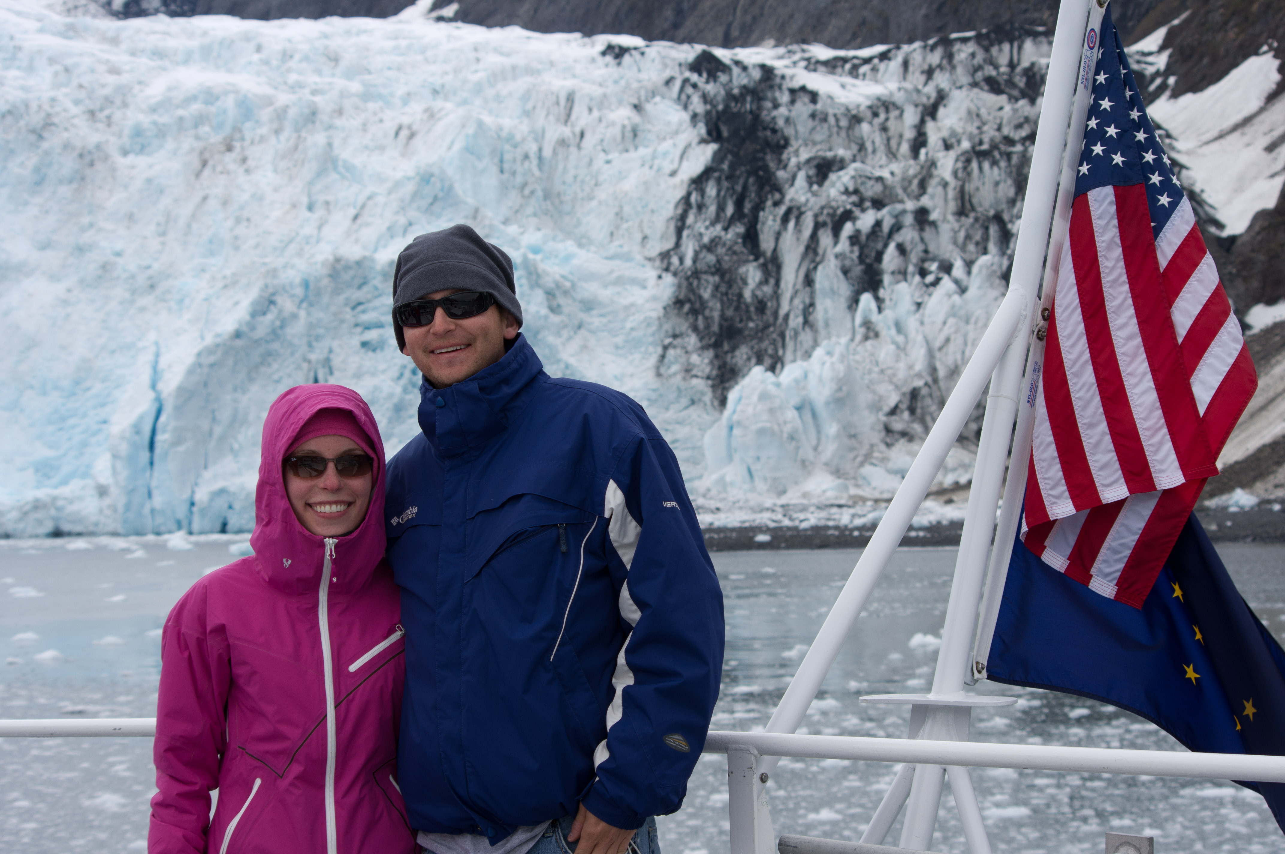 The boat stopped in a cove in front of an enormous glacier and we watched it calve. It sounded just like distant thunder and I thought for sure the whole glacier was about to drop into the water at any second! Those are “fake smiles” in that picture below. I’m surprised we don’t look as green as we felt!