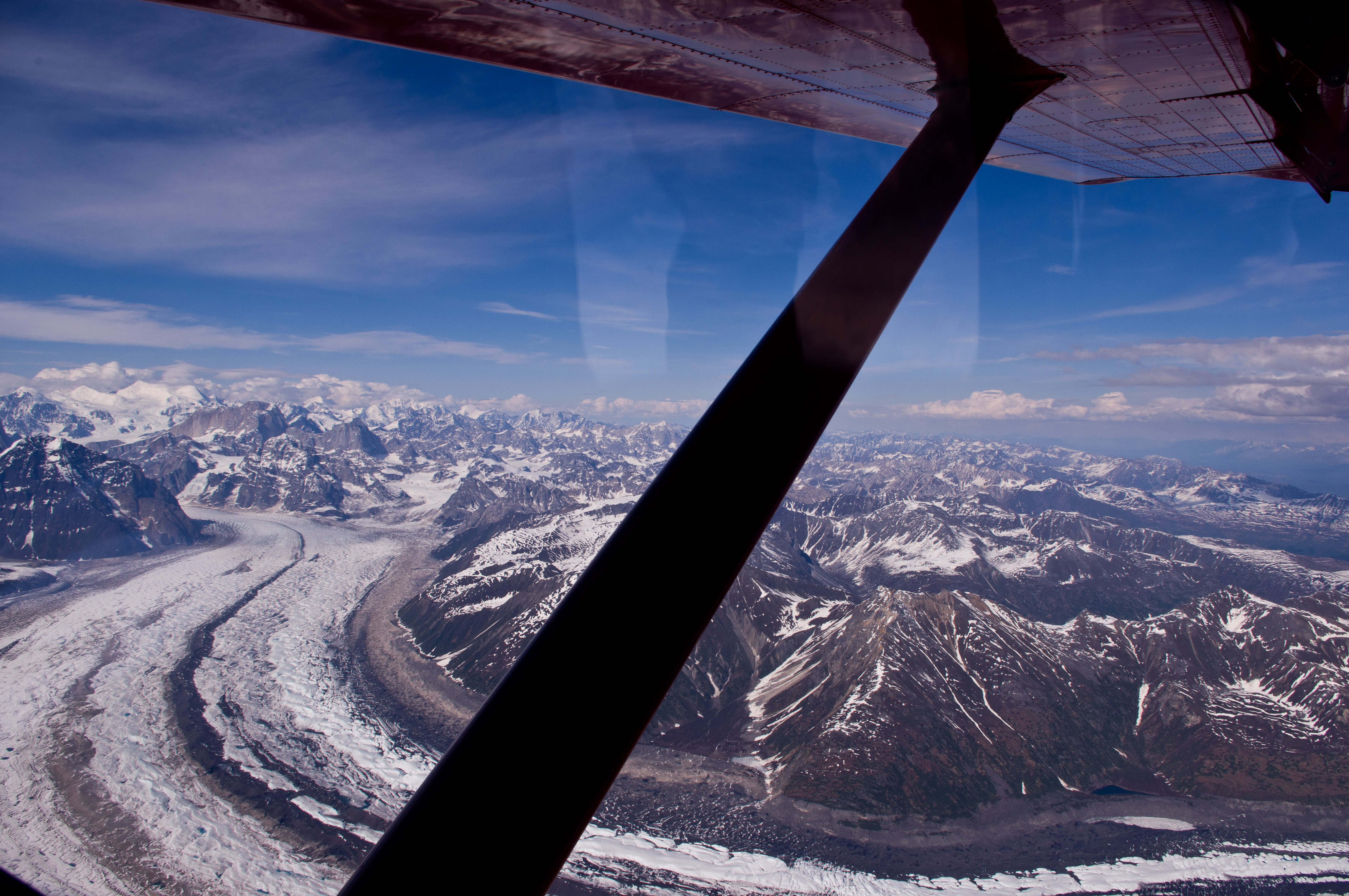 After flying through the mountains and weaving in and out of these huge canyons, we landed on a snow covered glacier. Everyone got out and we got to walk around for a while. You had to have sunglasses, at that elevation and with that much snow it was incredibly bright. Strangely enough, there was a cabin up there built by a pilot who passed away 20 or so years ago. His wife has been renting it out but apparently it’s already booked for the next 10-15 years. Talk about seclusion!